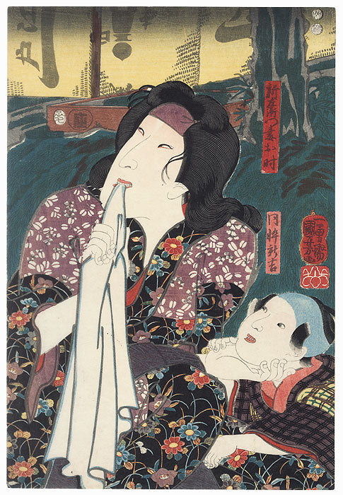 Comments - Terrific kabuki double portrait from the play "Meiyo jinsei roku" of Bando Shuka I as Otoki, the wife of Onio Shinzaemon, and her son, Shinkichi. She bites nervously on a cloth as she looks up with a worried expression, her eyes narrowed with suspicion. With her other hand she cradles her child's chin, the boy watching her with an eager smile. She wears a black kimono patterned with colorful blossoms and grasses, with purple floral insets over the shoulders. Shinkichi pats her leg reassuringly, his own small hand taking hold of hers. A handsome design with large figures, fine detail in the hair and faces, and lively color.