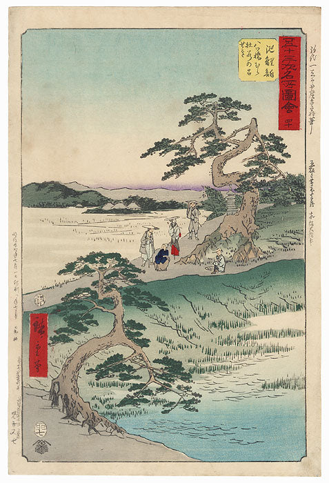 Pictures of Famous Places on the Fifty-three Stations (Vertical Tokaido) - Hiroshige's fantastic vertical Tokaido series was done in 1855 and represents a further evolution of his landscape design style, including some of his most modern designs. One of the striking features of this beautiful series was the vertical format, since the more common format for the landscape print was the horizontal. This unique approach allowed Hiroshige to experiment with the foreground and background contrasts that are typical of his work and seen in some of his other vertical landscape series. The concept for the vertical Tokaido grew out of the incredible popularity of the Great Tokaido (his first Tokaido series). Hiroshige wanted to expand on the theme, as the public was very interested in his fascinating images of life and travels along the most important thoroughfare in Japan- the road from Edo to Kyoto. From the urban center of Edo, where the journey began, to the beautiful rural landscape of the provinces more far away, the series is a set of handsome illustrations of Edo period Japan. This print is from the 1891 Memorial Edition of the series.